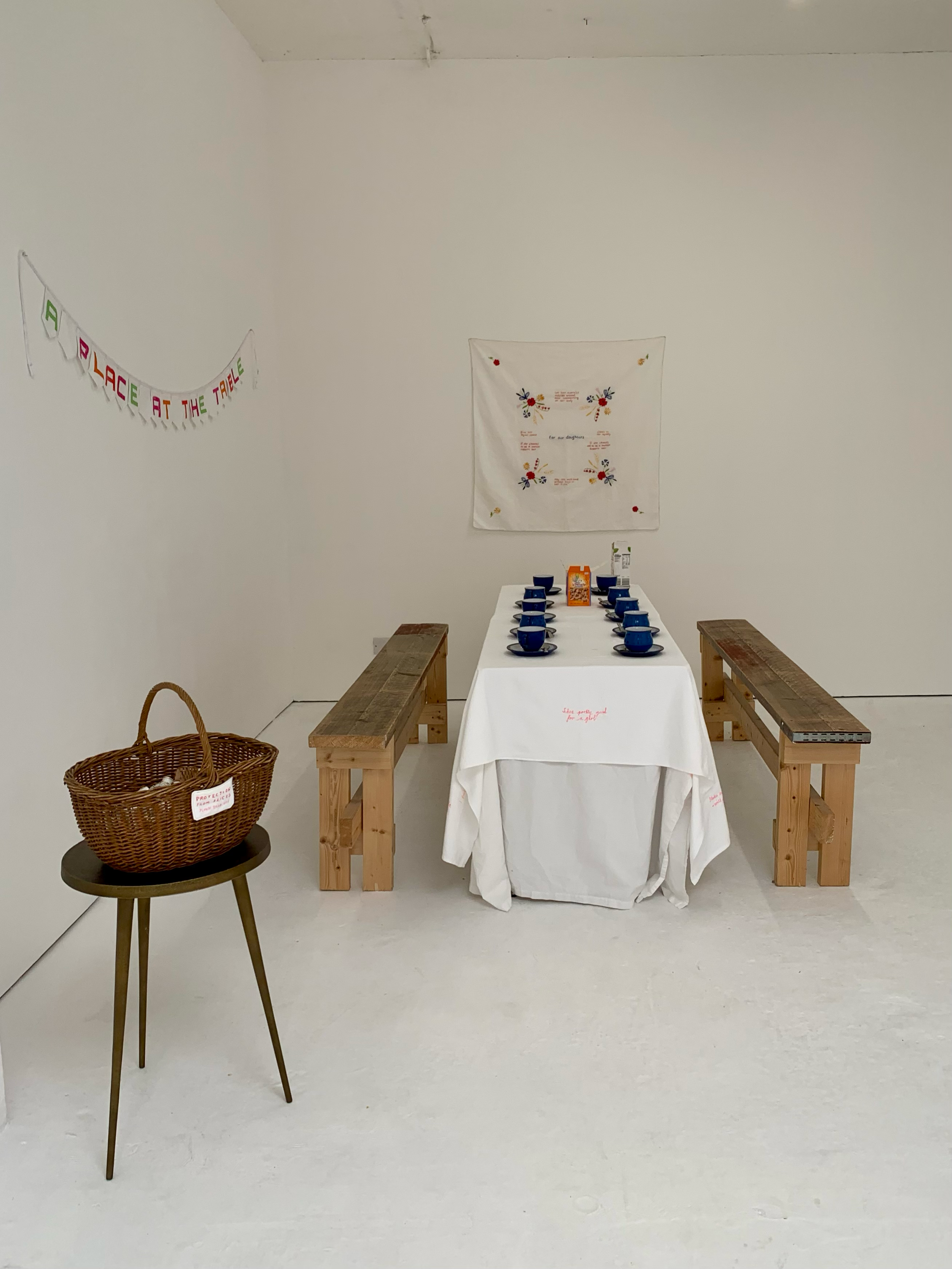 This project was a socially engaged installation that explored themes of everyday sexism and collective resistance through the domestic lens of craft and hospitality. Centred around a hand-embroidered tablecloth featuring testimonies from workshops with women, the work transformed maternal symbols, such as the taking of tea and fancy napkins, into a social sculpture that documented shared experiences. By blending feminist research with a practice-based approach, the installation created a communal space for dialogue, using the quiet act of embroidery as a form of material record-keeping and the ritual of sharing tea to foster inclusive conversations.